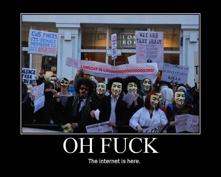 I live right next to the local Church of Scientology and sometimes I bump into the protesters. Far as I can tell, they do it because Scientology is funny (I mean, their devil is Galactic Emperor Xenu) and they think it's hilarious to dress up in V for Vendetta masks and yell "Free Xenu!" I don't really think they're trying to ACCOMPLISH anything...everyone knows the people inside are brainwashed and can't be reached, and it's not like there are really pedestrians who pass by the Scientology offices and are like, "Hey, that looks like it's worth checking out, let's go in and convert!" They just do it for fun, to say that it's an expression of some sort of proto-anarchist anti-authoritarian sentiment or is an inherently alienating form of expression is silly. Harumphing that it's distracting from the Serious Business of class struggle is even sillier.