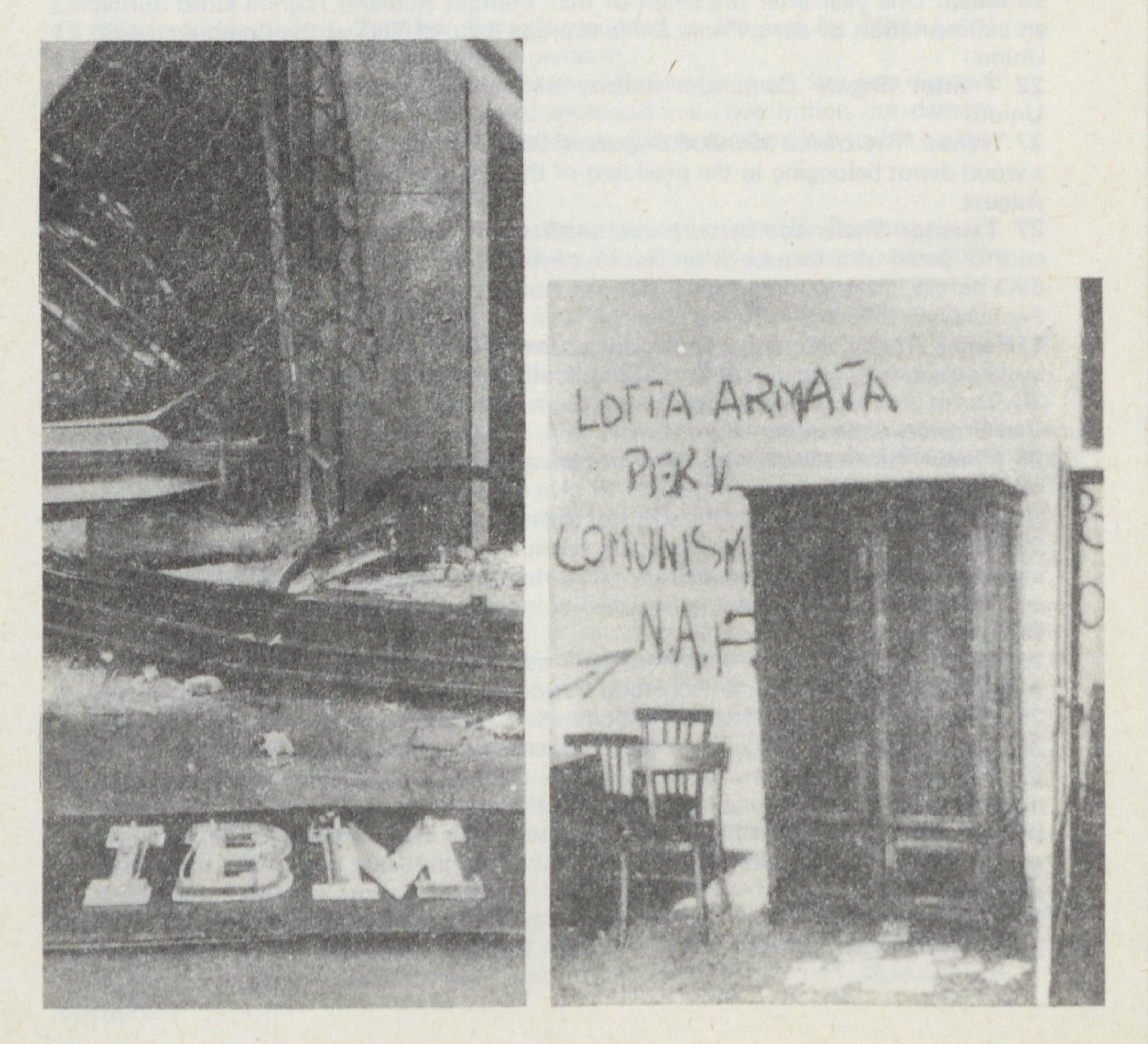 Alongside this organisation, which is working in Italian territory in a more or less efficient and coordinated way, there exists an infinity of small groups and individual militants who, without referring to any specific organisation and often using made up names, have developed a phenomenon of constant guerilla activity, constituting a very interesting point of reference for the development of the armed confrontation in Italy.