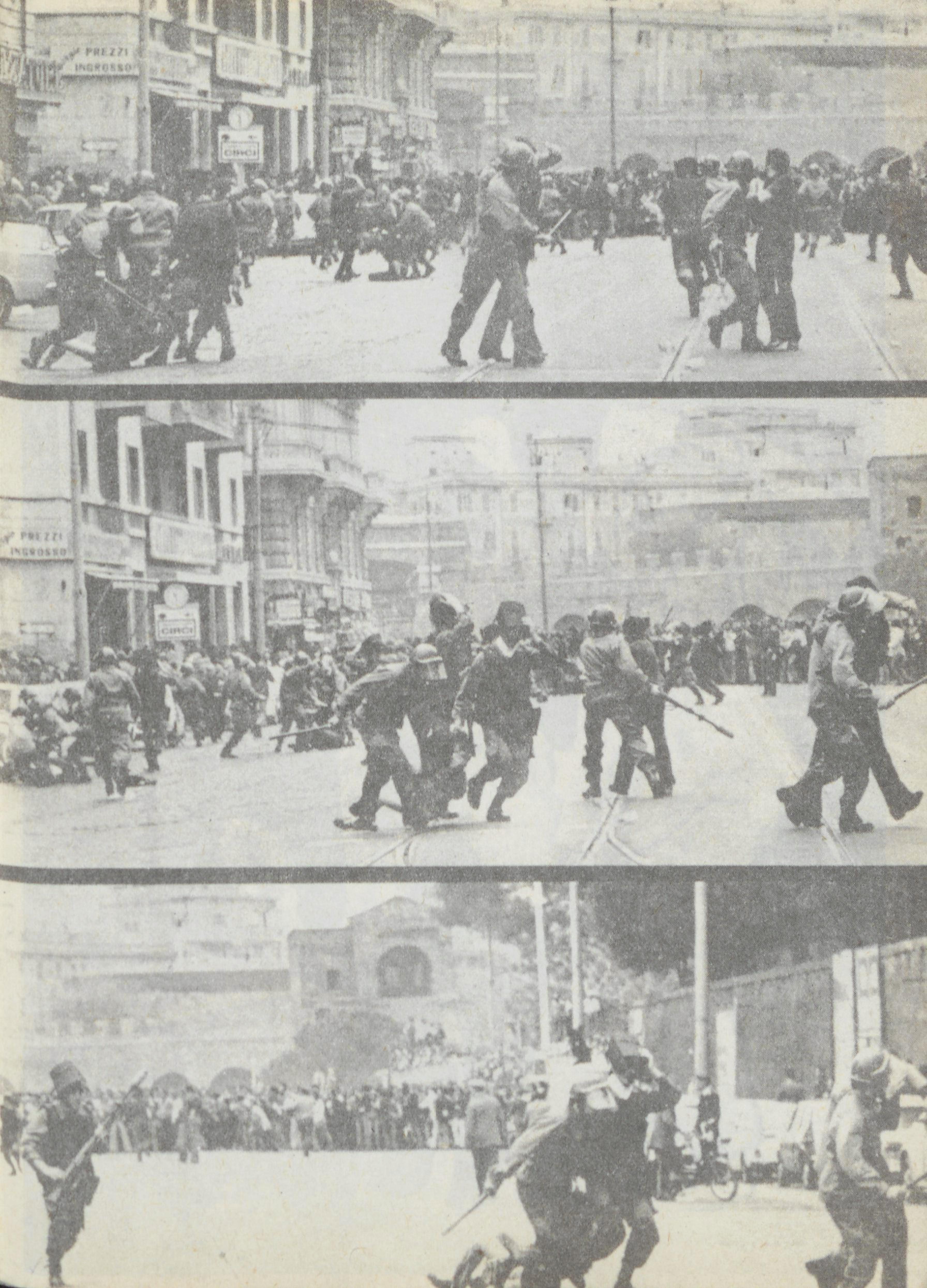 30 Naples: Unemployed workers, tired of demonstrations and broken promises, decide to make themselves heard. They attack the labour exchange and the central railway station, where they damage first class carriages. They build barricades in the city centre, take over buses and cars, and resist police onslaughts for over four hours. Offices and shops are devastated. 29 arrests are made.