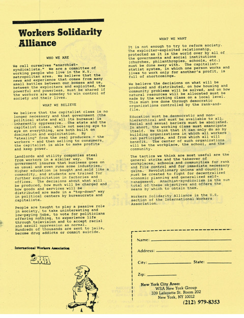 Side one, the graphic as shown. Side two, "Workers Solidarity Alliance: Who We Are, What We Believe, What We want"