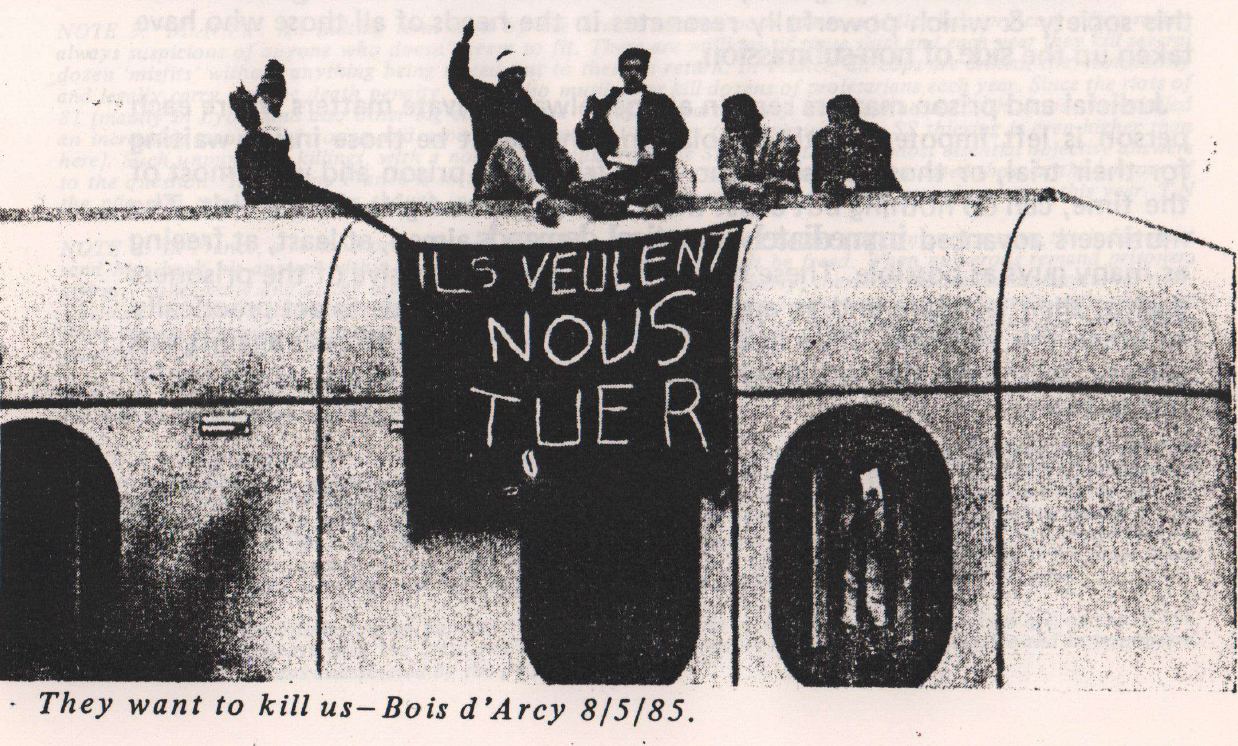 The prison administration and the media attributed the revolt at Fleury Merogis to a handful of political militants (notably to Action Directe). These militants, preoccupied by their fame alone, have always participated in this lie by not denying such attributes. All these liars had already played the same trick during the hunger strike which began developing at Fleury, at the end of 84. But we'll leave the militants to their dead verbiage.....