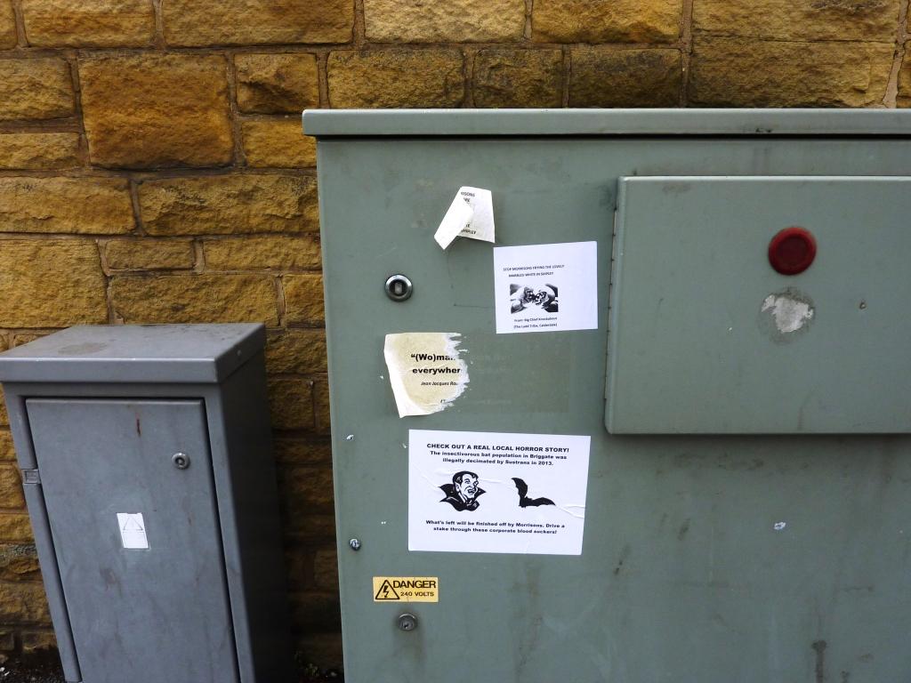 Below: Interestingly enough Bradford Council does possess a Banksy stencilled on the metal door of a utilities cupboard on Leeds Rd and also a place where stickers referring to the local ecocide were quickly torn off. It's laughable, because more to the point, a dumb Bradford officialdom doesn't even know they've got a Banksy otherwise they would have gotten their grubby little mittens on the piece years ago!!!!!