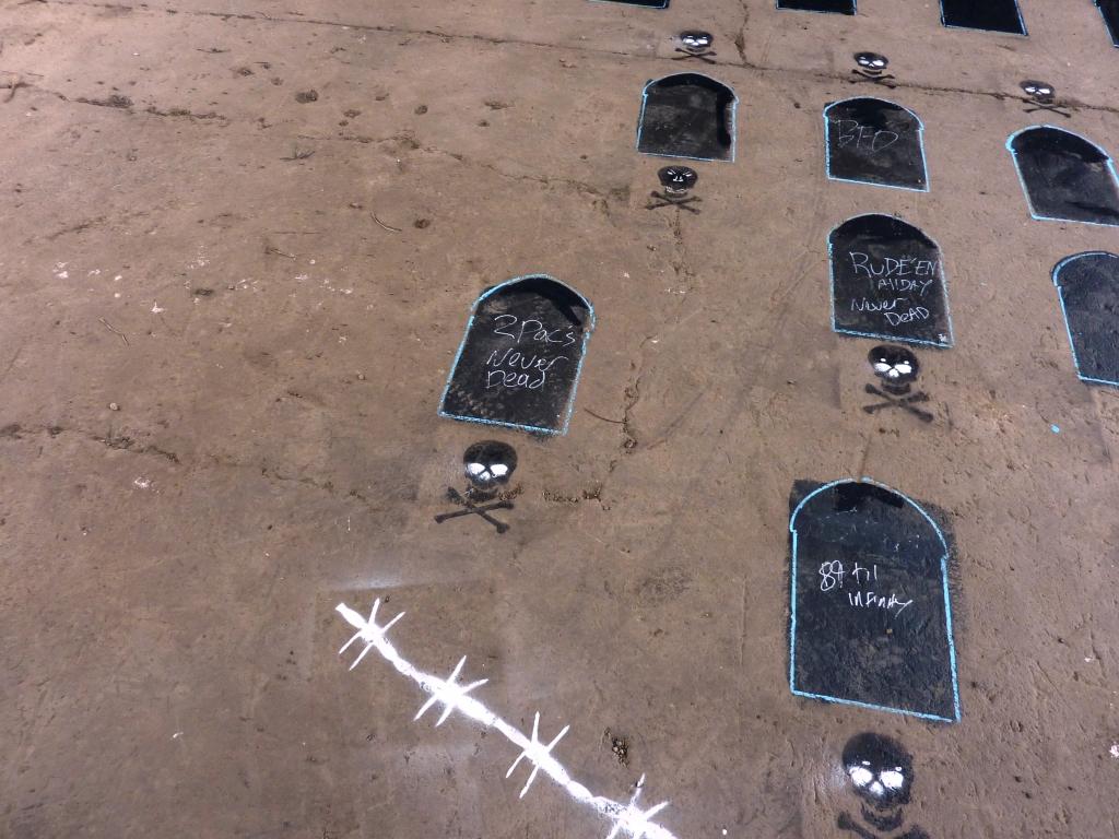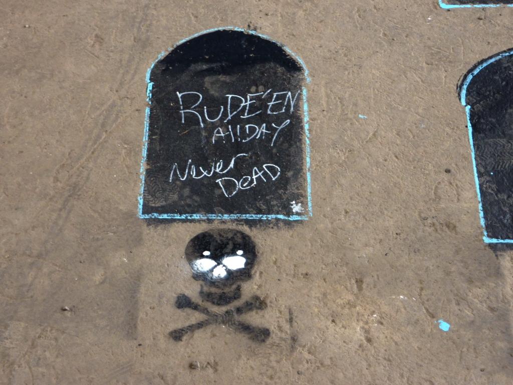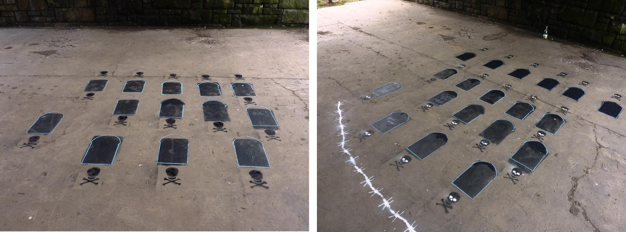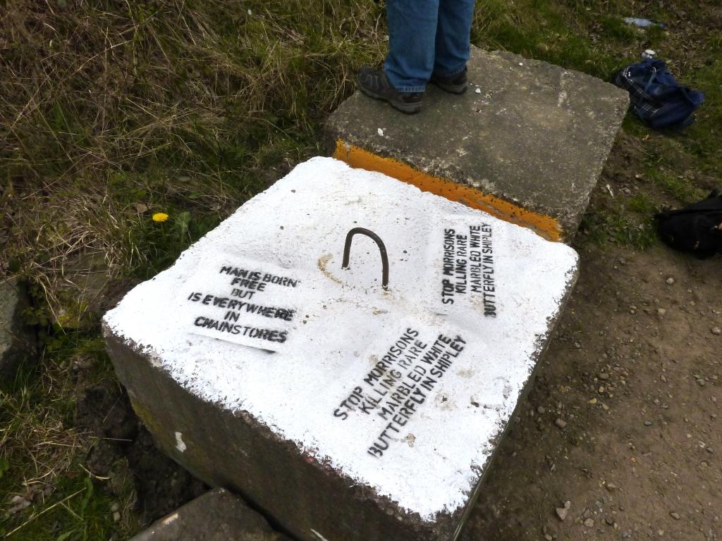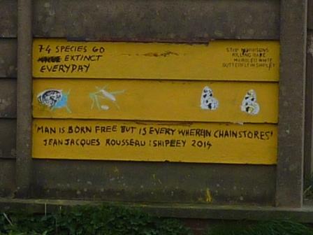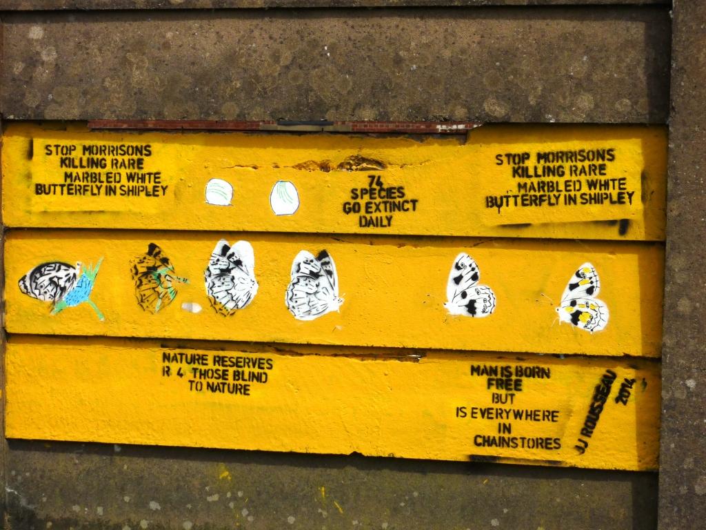 Below: Incensed that some philistine 'august' body had gotten ridden of most of the wall slogans on the Briggate site which pointed out the terrible ecocide that had taken place, a tableau – a war grave – to the disappeared and the dead was (it seems) partially erected. A mock graveyard was made, each grave to commemorate in big letters each species that had been slaughtered on this 2014 eco battlefield. Their names will liveth forever and there also was to be a grave to the unknown species. These species included The Common Blue, the Small Tortoishell, The Brown Argus, The Purple Hairstreak, the White Letter Hairstreak, the Brimstone, the Dingy Skipper, the Brimstone, the Marbled White, the Red Underwing, the Tawny Owl, The Green Woodpecker, the Greater Spotted Woodpecker, the Common Buzzard, the Kingfisher, the Goosander and so on. Interestingly, having only completed half the graveyard, undead local, young Bradford Goths immediately found the site and celebrated its existence while doing bike wheelies downing bottles of cheap lambrusco and putting their own inimical markers on some of the gravestones. Those who engaged in this wanton vandalism laughed with glee; having finally gotten through to some people!!