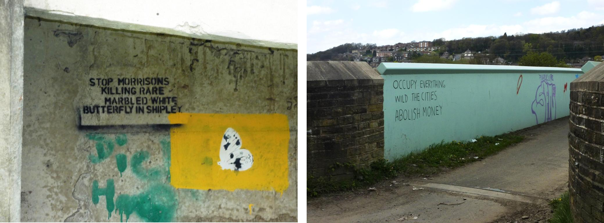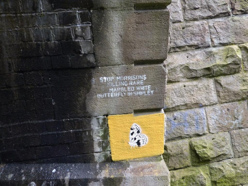 Within days the crudely executed comments were painted out (fig 2) and a lot of stickers were torn down. Obviously they had really struck home, official ecos desperate to get rid of our unseemly comments and Shakespeare's quip, "The truth must be silent, go to your considerate stone" as accurate as 400 years go. Immediately, (it seems) newer, more polished versions of the same comments were reinstated!!! Interestingly this happened more or less on the same day a priceless Banksy was 'discovered' on a Cheltenham wall whereby the council then rushed-in to save the piece from "vandalism" (would you believe) eager to preserve ART AND MONEY even though the piece was a discreet comment on the nearby GCHQ surveillance headquarters. As far as the Bradford pieces were concerned some official body rushed in to obliterate all comments while saving the visual outlines of the life history of the Marbled White butterfly! Nowadays, it would seem, all banal purely visual and empty tags and pieces are officially venerated whilst all subversive slogans, no matter how innocuous, are instantly painted out. You couldn't make it up ...........