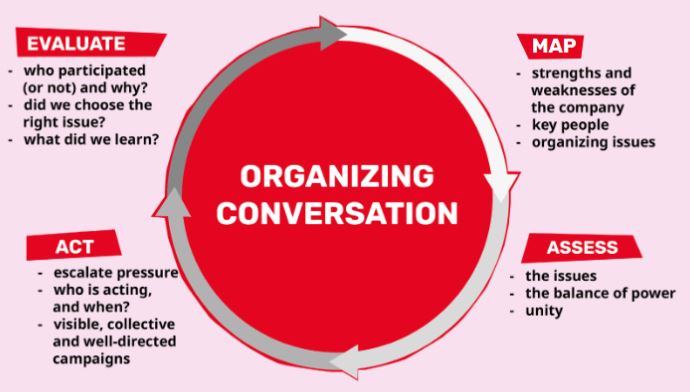 The first phase is to map the workplace, the second phase is to assess, the third to act and the fourth to evaluate the struggle. I’ll explain each phase in turn. The common thread through all phases is organizing conversations – that is, talking and above all listening to co-workers.