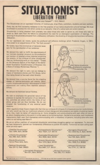 A leaflet parodying the plethora of post-Situationist groupuscules which sprang up in California in the 1970s. Variously attributed to the Reinvention of Everyday Life group (Palo Alto, CA) or "members from various Berkeley Post-Sit groups".