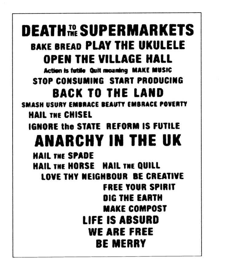 In reality the dominant 'Back to the Land' movement in the UK has been anything but fascistic, rather it tends to be too well meaning, a wishy-washy liberalism lacking real and necessary hard edged critique. Moreover the hippy experience in the late 1960s and afterwards has continually shaped its future and King Mob had relations with the West Country commune anarcho individuals around HAPT and Sid Rawle of the Diggers could often been seen on the streets of an alternative, pre-gentrified Notting Hill in London. We were always on friendly, nodding terms with each other. It's no surprise therefore that one of their latter-day offspring, the Vaneigem quoting Idler has its centre nearby on Westbourne Grove. Their praiseworthy anti work perspective however stops well short of a sound, thorough going revolutionary critique of work falling back so often on social democratic measures, as in a recent rather dull article for the Independent newspaper by its 'leader' Tom Hodgkinson listing 8 hour day / four days a week working measures enacted by a variety of progressive state legislative acts over the last 100 years or so, acts which never amounted to all that much. You won't though get far with the Idler if you think the paper might discuss the increasing insubstantial character of surplus value creation, hi-tech and automation – and a critique that points to a real exit from the nightmare of disintegrating capitalism. Without saying too much here perhaps it's best to merely show a typical poster from the Idler Academy in London, which we obviously go along with to some degree fitting in to sufficiently with enough of an authentic wilding perspective, but oh, so much else is missing.........