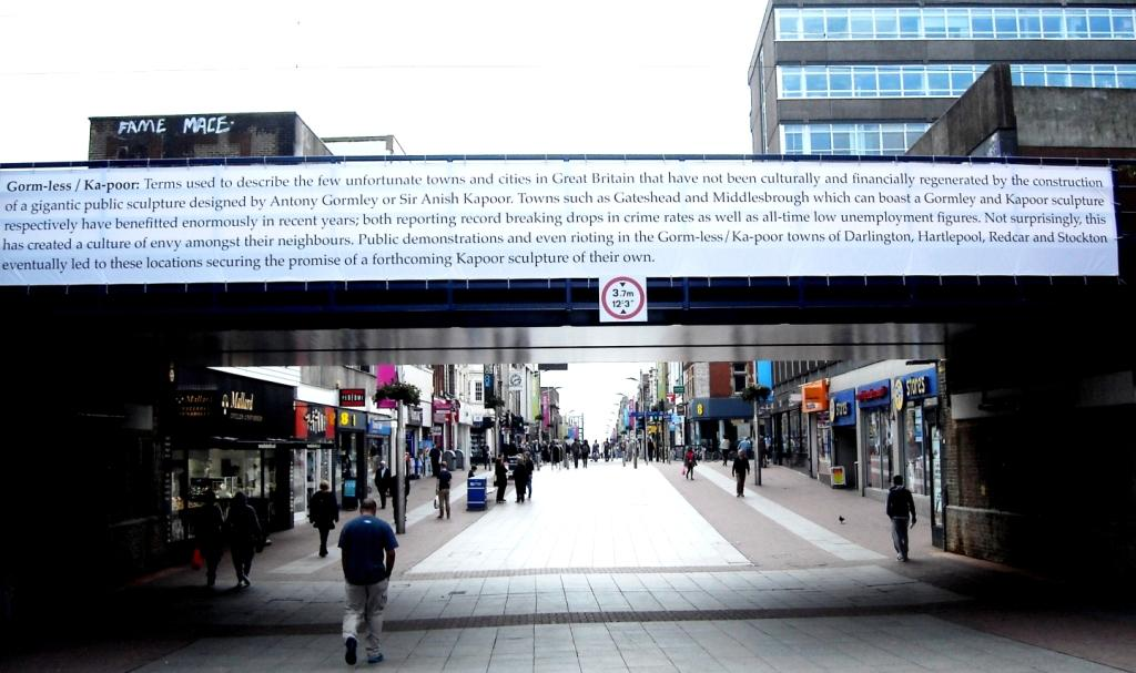 Gormless / Ka-poor: terms used to describe the few unfortunate towns and cities in Great Britain that have not been culturally and financially regenerated by the construction of a gigantic public sculpture designed by Antony Gormley or Sir Anish Kapoor. Towns such as Gateshead and Middlesbrough which can boast a Gormley and Kapoor sculpture respectively have benefitted enormously in recent years; both reporting record breaking drops in crime rates as well as low unemployment figures. Not surprisingly, this has created a culture of envy amongst their neighbours. Public demonstrations and even rioting in the Gormless / Ka-poor towns of Darlington, Hartlepool and Stockton eventually led to these locations securing the promise of a forthcoming Kapoor sculpture of their own.