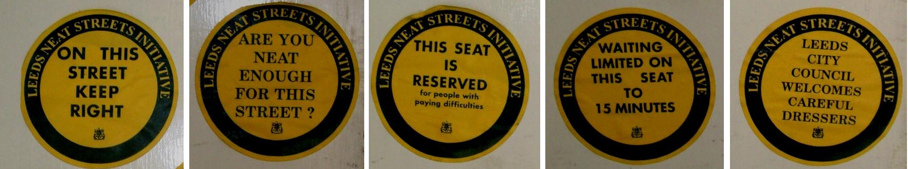 In the early to mid 1990s, just before the dawn of CCTV, the Here & Now Collective (ironically in Leeds) produced a series of official looking roundel stickers that pointed towards the coming Dark Age where all aspects of everyday life and behaviour will be monitored and policed. It was prescient stuff and some individuals in the Here & Now Collective spent a few days observing how people in Leeds in public spaces such as squares and amenity parks reacted to these stickers. They were noted alright – occasionally with consternation – whilst the majority blandly accepted them. Sadly no survey results were ever written up.