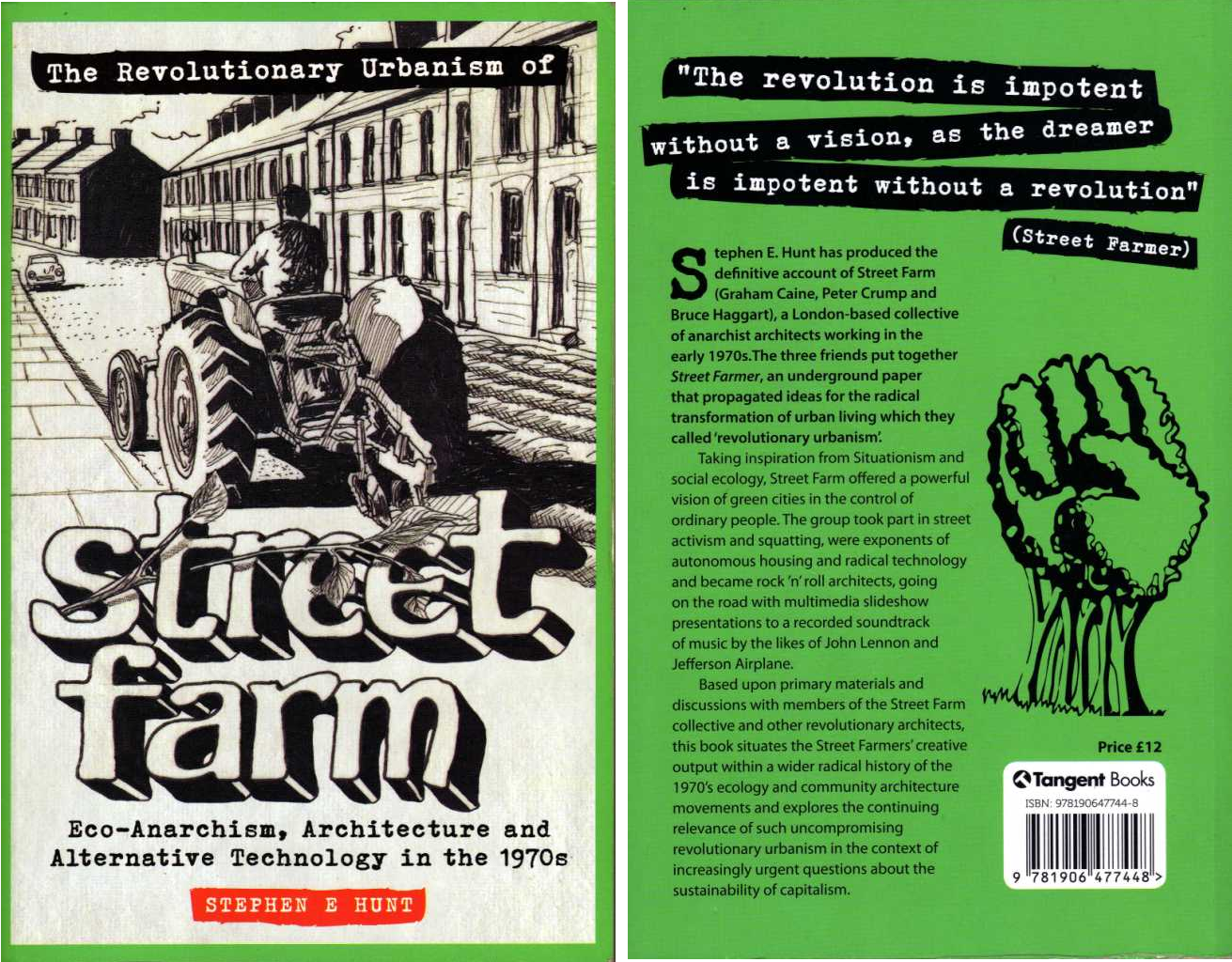 Street Farm (SF) was based on the excellent concept that via an open-ended revolutionary urbanism a profusion of organic growth would take over from concrete, steel and brick structures plus that vista of permanent purgatory - yet to be born - of a shorn, manicured, endless malling where all hopes of rich biodiversity are forever stifled; a terrain which has appropriately been called "hostile architecture." For SF "The land belongs to the communities of the biosphere, and NOT individuals of the human race." Anarchism was at the core of these beliefs instigated by a latter day evolution, especially the eco-anarchism of Murray Bookchin's Institute of Social Ecology though taking into its orbit, Durutti's prescient comment during the Spanish revolution of 1936-9 which, ironically could have come from the mouth of a contemporary neo-psychogeographer: "We are not in the least afraid of ruins.... [...] We carry a new world in our hearts," though this wasn't via some sales pitch of an art gallery display but an on-the-ground, full blown practical insurrectionary reality. SF even skirted with a certain belief in anarchist trade unionism, (which we by then in the early 1970s had consigned to history along with the rest of TU bunkum) supported the British miners and even had one bona fide anarchist farm worker within its tiny ranks. The boring anarchist illustrator, Clifford Harper was also a friend of Street Farm in the Kentish Town squatter community and he later distilled some of their ideas in dull and pedestrian plans for a utopian rural community of 2000 people; an anarchist yawn which comrades in late 1970s Leeds called "a boy scout camp" or "William Morris going belly-up".......