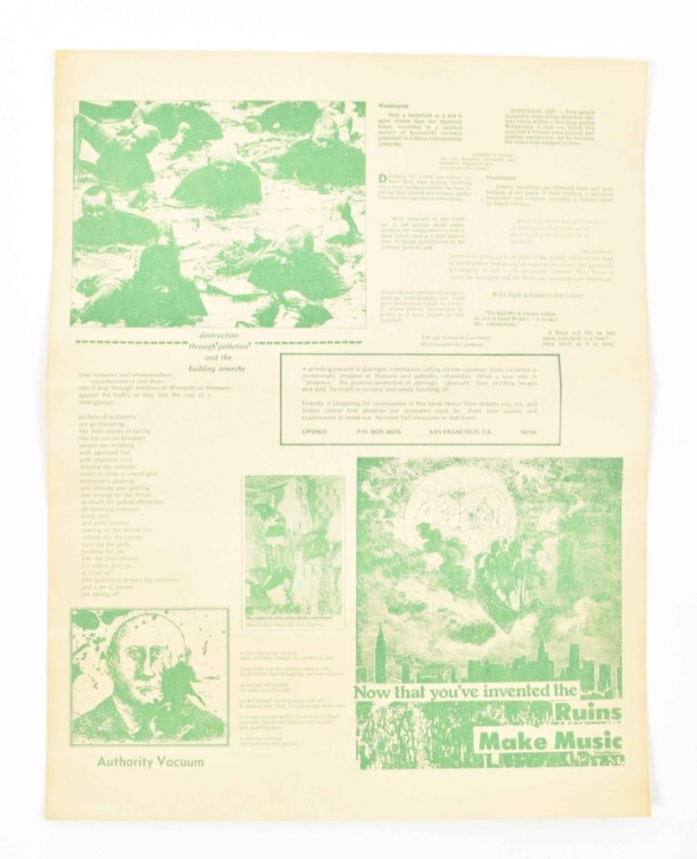 A collection of flyers by Upshot↑ - a post-situationist group based in San Francisco in the late 1970s. Members included John and Paula Zerzan. Author John Zerzan Paula Zerzan post-situationist San Francisco Comments