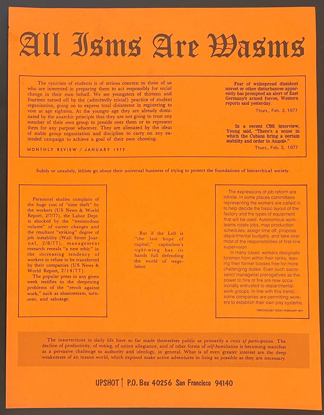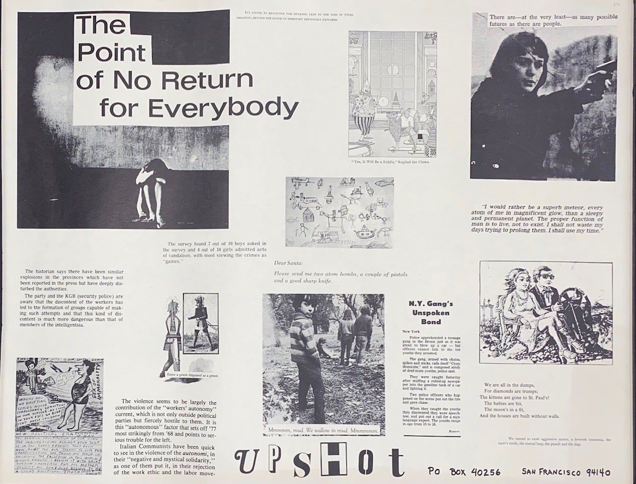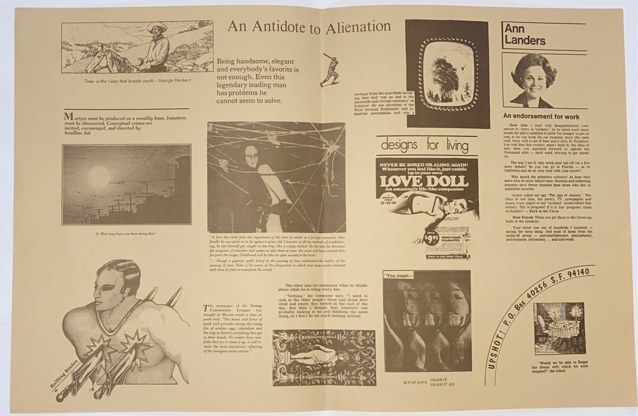 A collection of flyers by Upshot - a post-situationist group based in San Francisco in the late 1970s. Members included John and Paula Zerzan. Author John Zerzan Paula Zerzan post-situationist San Francisco Comments