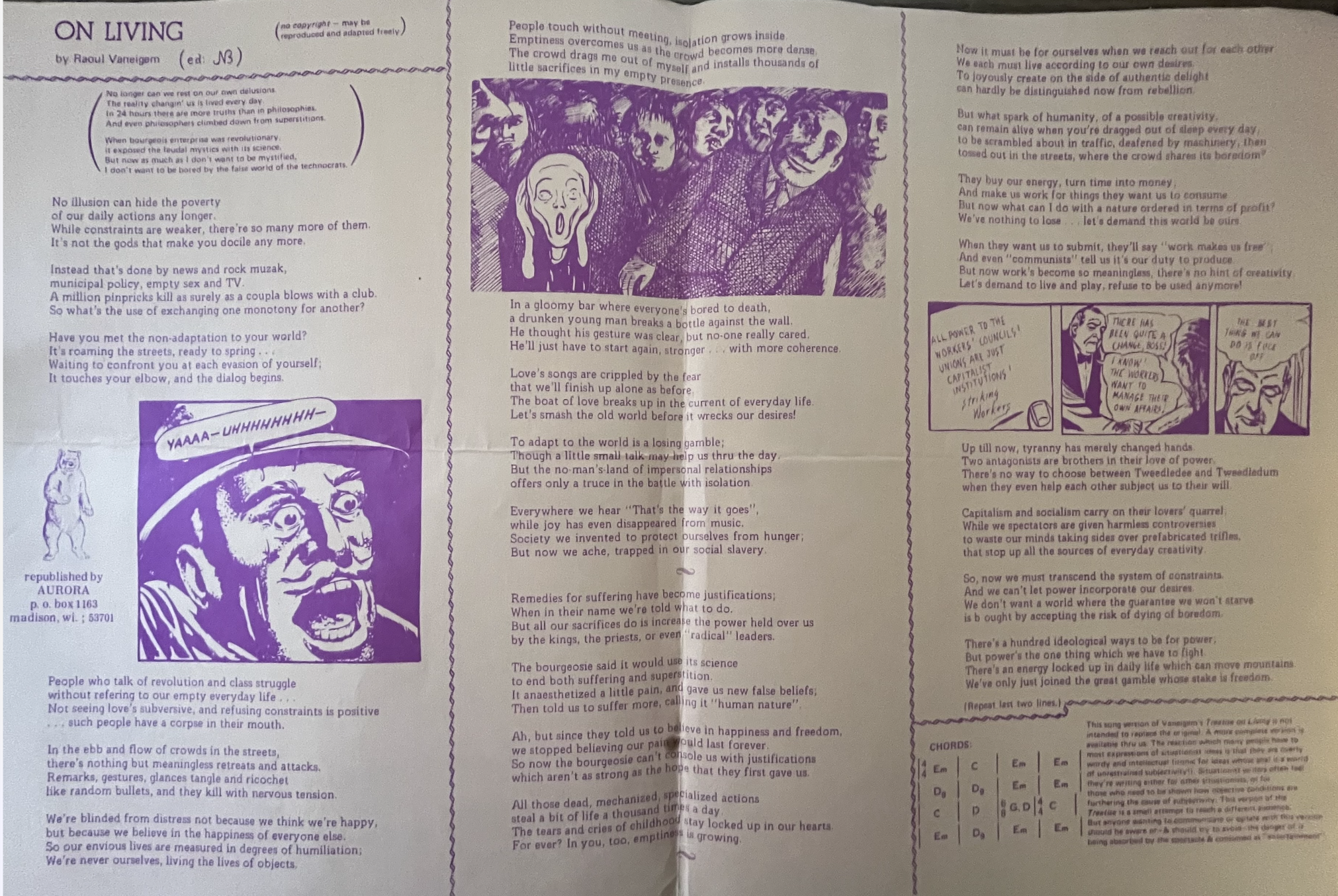 On the opposite side of the poster the authors reprint, as poster, the “On Living” pamphlet originally published by the California-based pro-situ group Reinvention of Everyday Life.