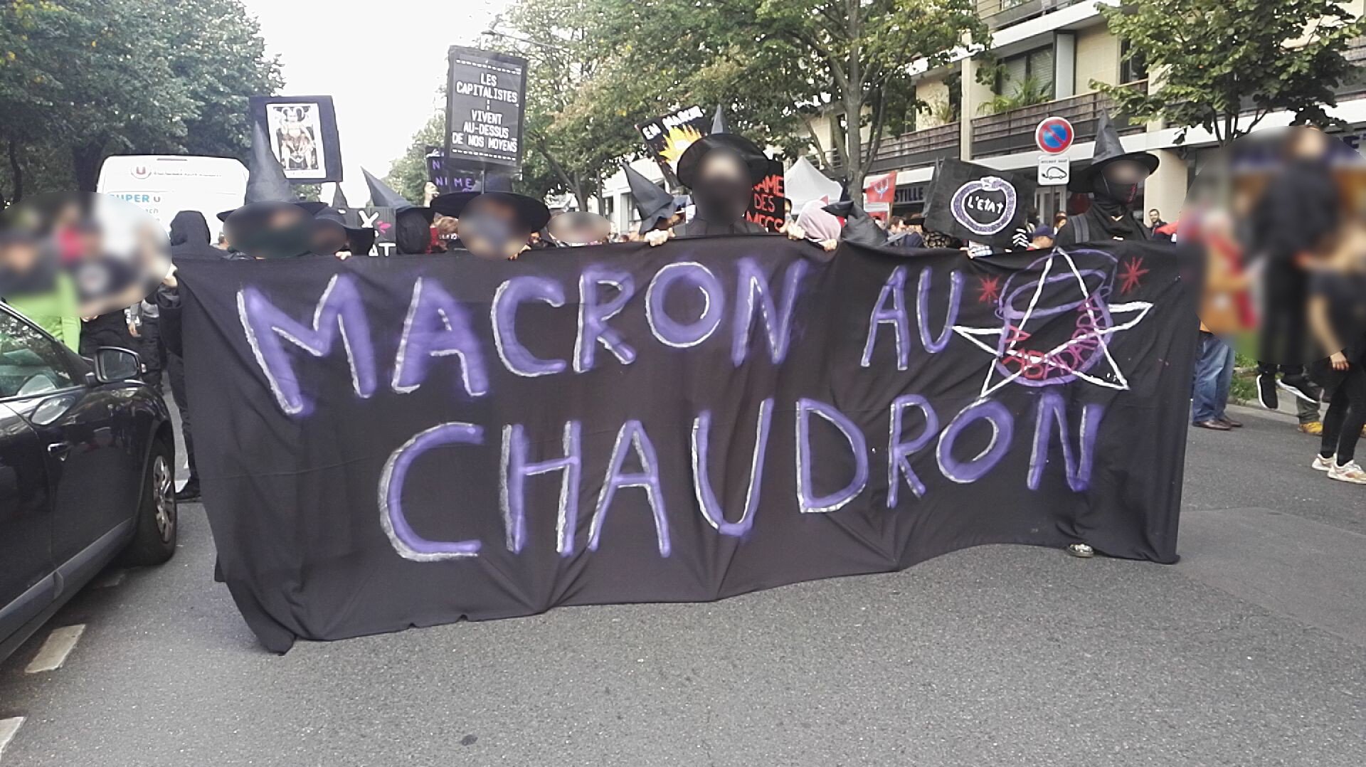 -By 1:30 the school students group at République had grown to 300 and set off for Bastille. There was a group of 100 students at Jussieu university campus. At Bastille the Union vehicles were setting up and the WITCH bloc was forming3 The Witch block marched behind a banner ‘Macron au Chaudron’, meaning Put Macron in the Cauldron.